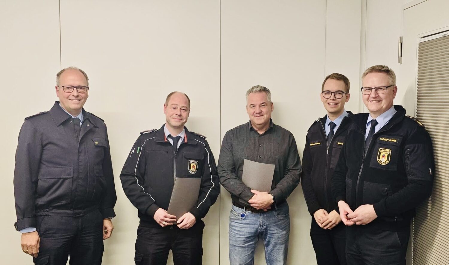 Im Rahmen der jüngsten Sitzung des ständigen Arbeitskreises ABC-Einsatz der Kreisfeuerwehr Osnabrück wurde Andre Friedrich-Winter von der Werkfeuerwehr Georgsmarienhütte GmbH mit Wirkung vom 01.01.20026 offiziell zum neuen Zugführer des Fachzugs 4 „Messen + Spüren“ ernannt. Er folgt auf Oliver Eckl, der nach vielen Jahren engagierter Leitungstätigkeit aus seiner Funktion ausscheidet. Kreisbrandmeister Ludger Flohre nahm die Übergabe im feierlichen Rahmen vor und würdigte dabei das langjährige Engagement und die hervorragende Arbeit von Eckl