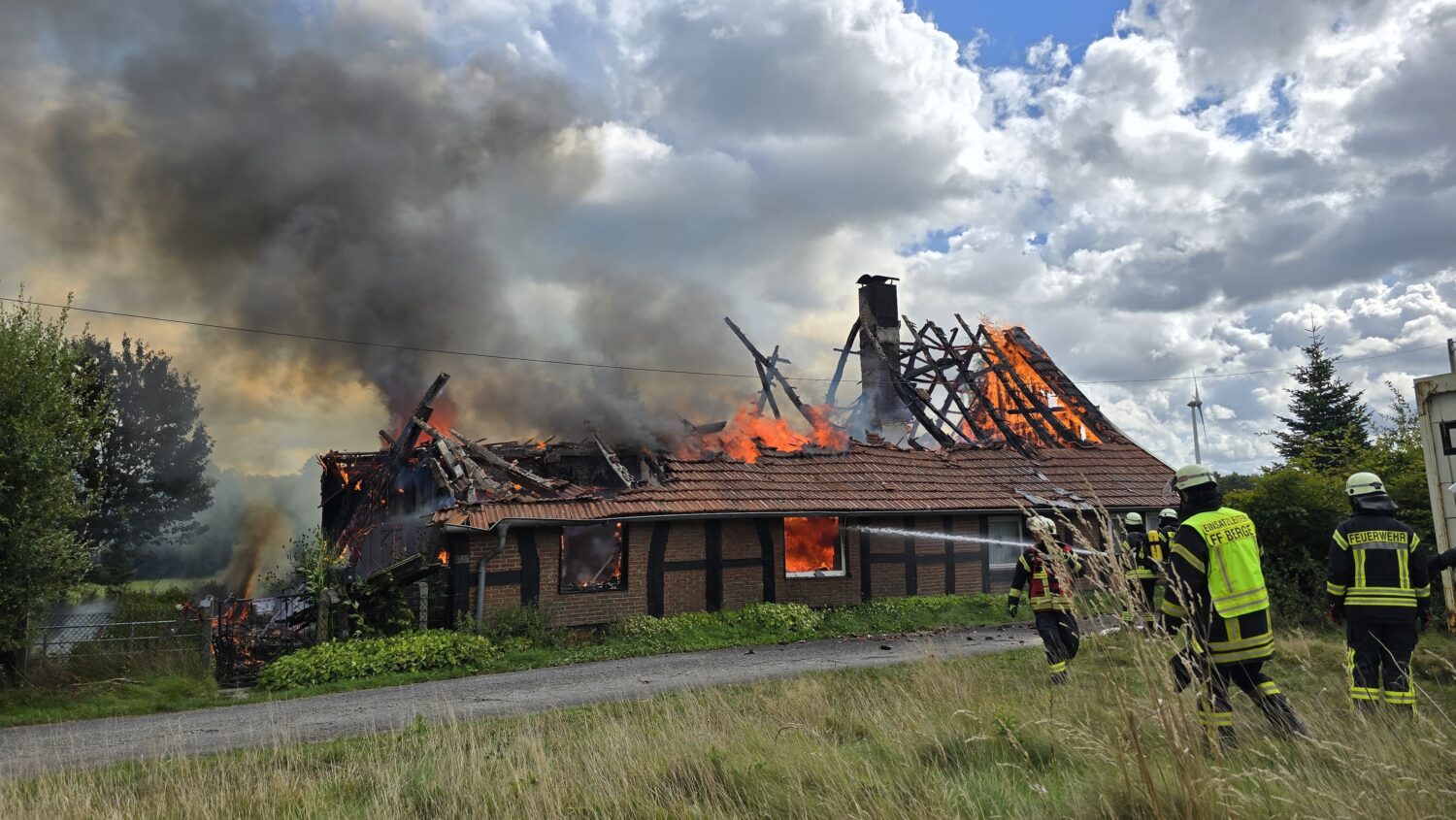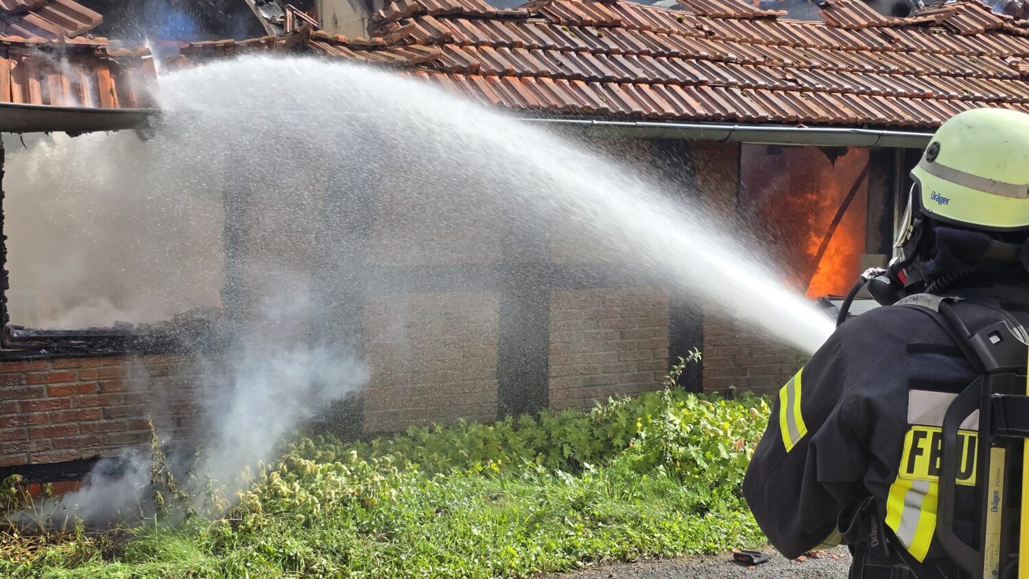 Beim Eintreffen der ersten Kräfte aus Berge stand eine Seite des Dachstuhls eines alten Fachwerkhauses bereits im Vollbrand. Das Feuer breitete sich rasant auf den gesamten Dachstuhl aus, die Flammen schlugen sichtbar aus dem Gebäude. Der Bewohner konnte sich rechtzeitig ins Freie retten, sodass sich die Feuerwehr vollständig auf die Brandbekämpfung konzentrieren konnte. Sechs Hunde wurden durch den Besitzer sowie durch Feuerwehrangehörige betreut.