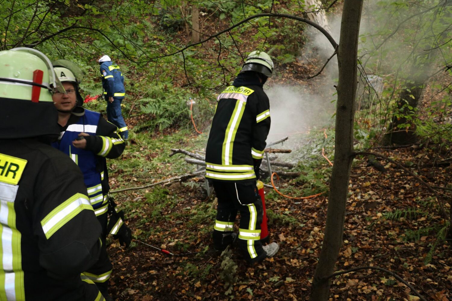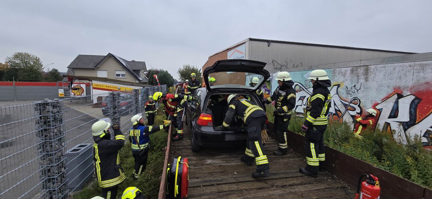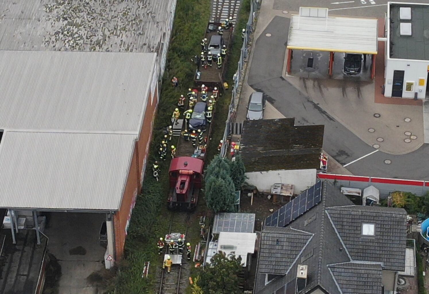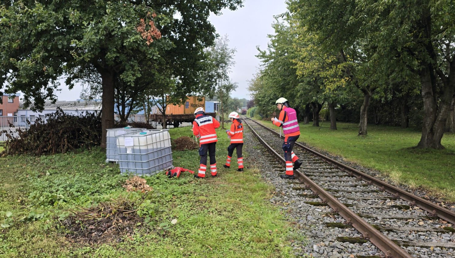 Im zweiten Abschnitt standen die Helfer vor weiteren Herausforderungen. Neben der Lok waren auch mehrere Pkw auf Güterwaggons betroffen, in denen fünf Übungspuppen die verletzten Personen darstellten. Mit schwerem Gerät mussten sie befreit und gerettet werden. Im weiteren Verlauf kam es zu einer zusätzlichen Gefahrenlage, da ein beschädigter IBC-Behälter mit Gefahrstoff leckgeschlagen war und auszulaufen drohte. Die Einsatzkräfte dichteten die Leckage ab, um ein Eindringen in ein nahegelegenes Gewässer zu verhindern. Parallel dazu wurde eine Riegelstellung aufgebaut, um ein angrenzendes Flüssiggaslager vor einer möglichen Brandausbreitung zu schützen.