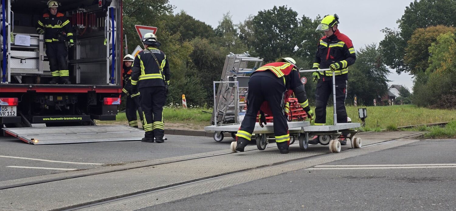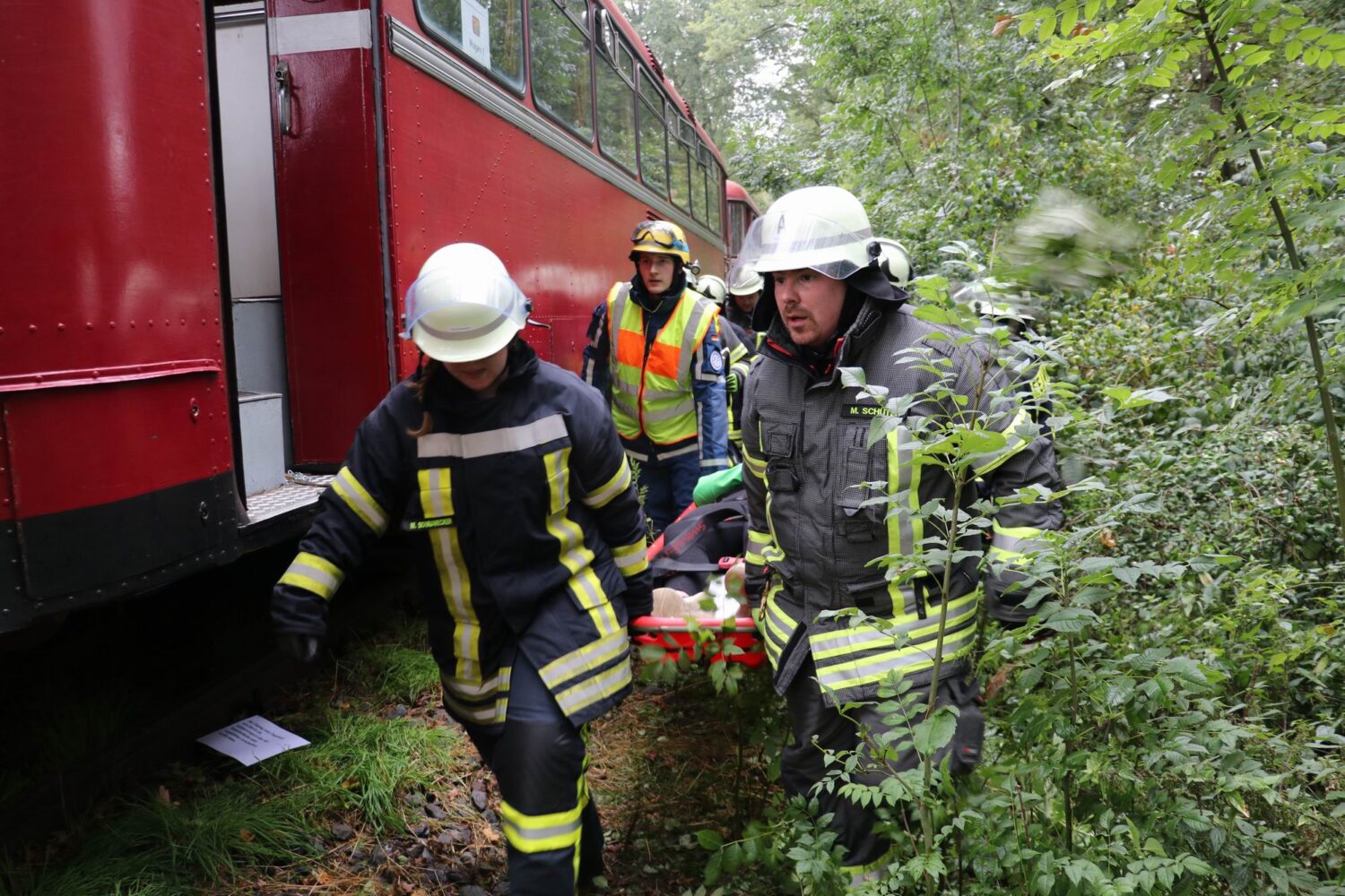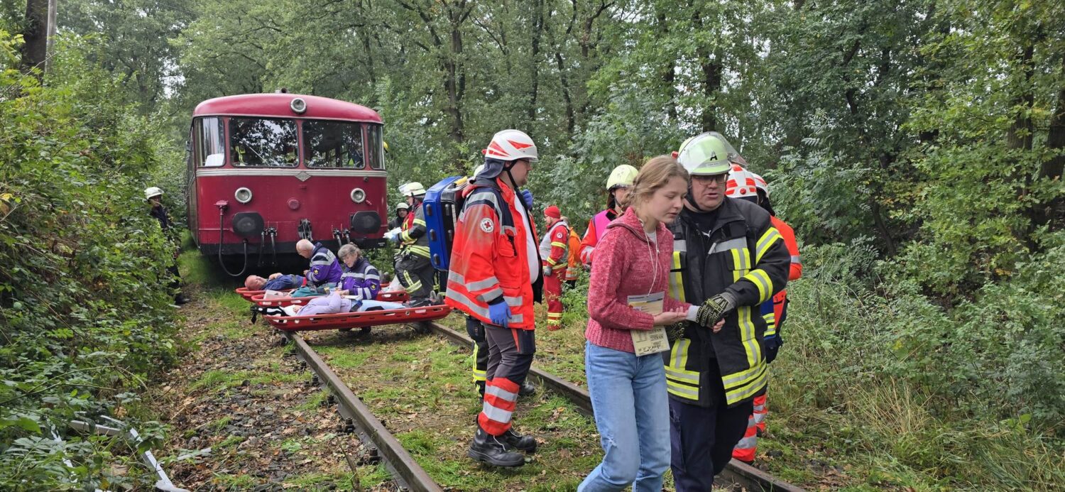 Mit einem realitätsnahen Szenario haben die Technischen Einheiten Bahn der Kreisfeuerwehr Osnabrück am Samstag ihre Einsatzbereitschaft und Zusammenarbeit unter Beweis gestellt. Geprobt wurde ein schwerer Zugunfall zwischen Ankum und Bersenbrück. Ein Personenzug kollidierte bei voller Fahrt mit einer umgestürzten Eiche. Durch die Wucht des Aufpralls entgleisten mehrere Waggons, der Zug trennte sich in zwei Teile. Während ein Abschnitt am Unfallort zum Stehen kam, rollten weitere Wagen mehrere Hundert Meter weiter. Zahlreiche Fahrgäste wurden verletzt und in den Waggons eingeschlossen.