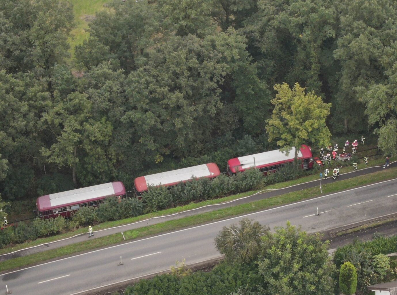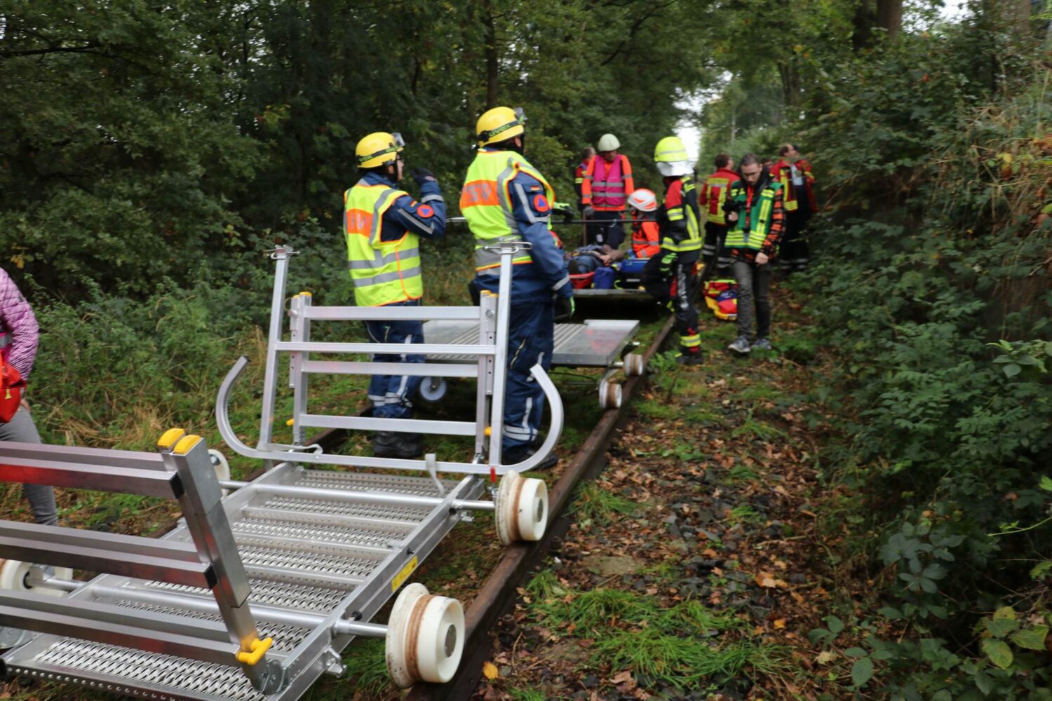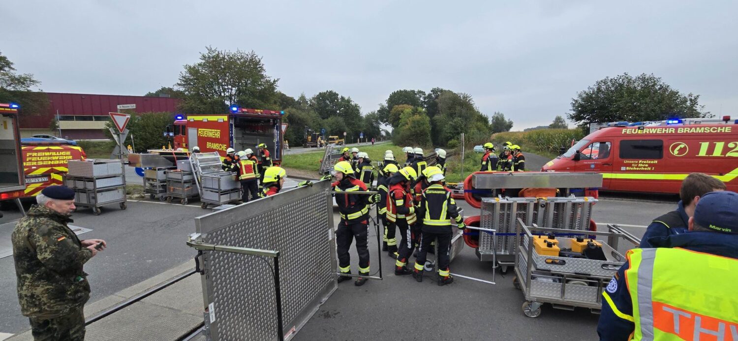 Mit einem realitätsnahen Szenario haben die Technischen Einheiten Bahn der Kreisfeuerwehr Osnabrück am Samstag ihre Einsatzbereitschaft und Zusammenarbeit unter Beweis gestellt. Geprobt wurde ein schwerer Zugunfall zwischen Ankum und Bersenbrück. Ein Personenzug kollidierte bei voller Fahrt mit einer umgestürzten Eiche. Durch die Wucht des Aufpralls entgleisten mehrere Waggons, der Zug trennte sich in zwei Teile. Während ein Abschnitt am Unfallort zum Stehen kam, rollten weitere Wagen mehrere Hundert Meter weiter. Zahlreiche Fahrgäste wurden verletzt und in den Waggons eingeschlossen.