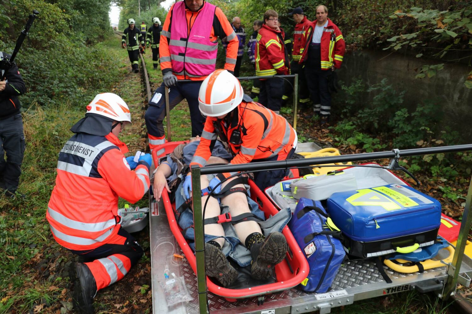 Um die Lage zu bewältigen, teilten die Einsatzkräfte das Szenario in zwei Abschnitte auf. Im ersten Abschnitt mussten die Retter insgesamt 13 verletzte Personen aus drei Personenwaggons befreien. Das Team der Realistischen Unfall- und Notfalldarstellung des DLRG hatte die Verletztendarsteller mit täuschend echten Verletzungen geschminkt und vorbereitet. Schmerzverzerrte Schreie und Hilferufe sorgten dafür, dass die Einsatzkräfte unter möglichst realistischen Bedingungen arbeiteten. Erschwert wurde die Situation durch einen parallel entstehenden Wald- und Böschungsbrand sowie eine technische Störung, die infolge des Funkenflugs im Umfeld des Zuges ausgelöst worden war.